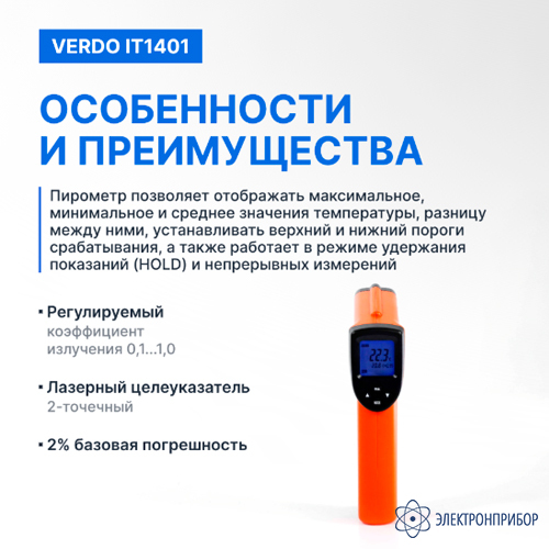Особенности пирометра портативного (-50…580°С)/(±2% или ±2°С); DS=16:1; k=0,1…1,0; 2 лазера VERDO IT1401: