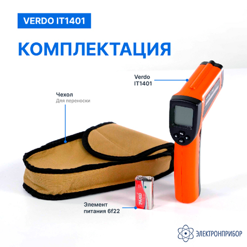 № Наименование Количество 1 Пирометр портативный (-50…580°С)/(±2% или ±2°С); DS=16:1; k=0,1…1,0; 2 лазера VERDO IT1401 1 2 Элемент питания типа 6F22 1 3 Чехол для переноски 1 -