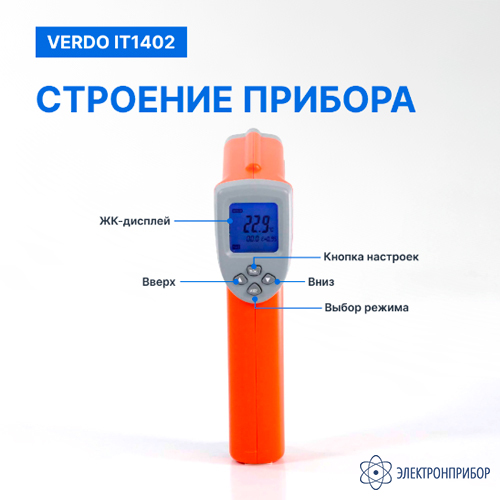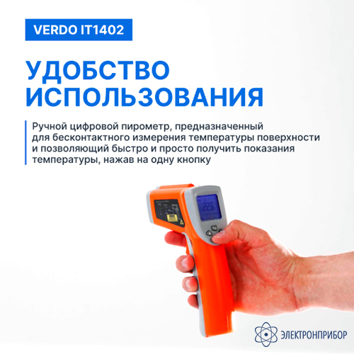 Инфракрасный пирометр Verdo IT1402 – бесконтактный измерительный прибор, предназначенный для быстрого и точного определения температуры поверхности различных объектов. Он использует инфракрасную технологию для обнаружения и анализа инфракрасного излучения, испускаемого объектом, и преобразует его в электрические сигналы для отображения температуры на цифровом дисплее.