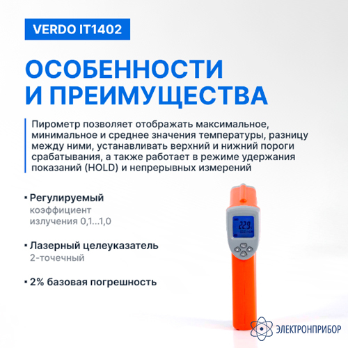Особенности пирометра портативного (-50…880°С)/(±2% или ±2°С); DS=16:1; k=0,1…1,0; 2 лазера VERDO IT1402: