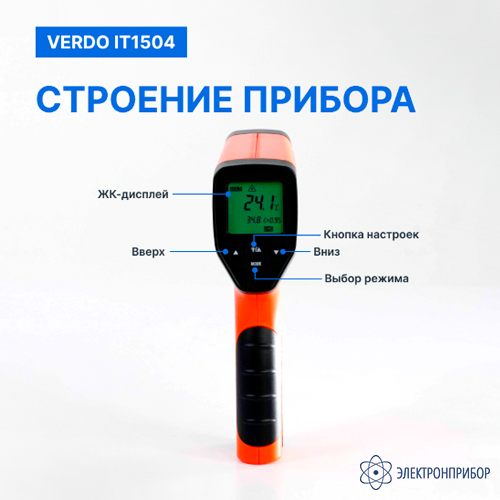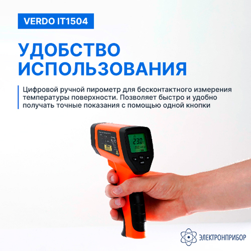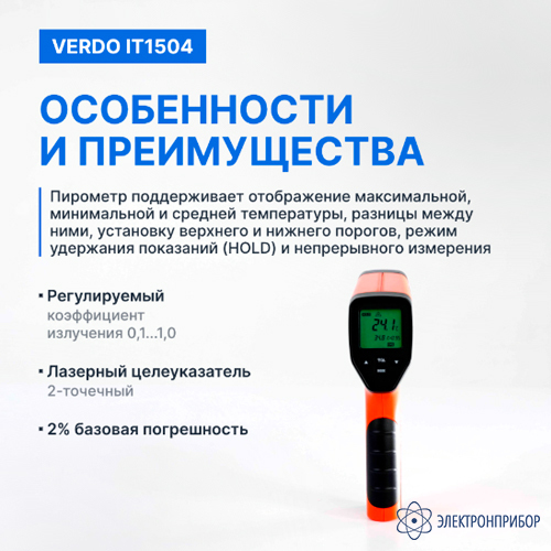 Инфракрасный пирометр Verdo IT1504 бесконтактный измерительный прибор, предназначенный для быстрого и точного определения температуры поверхности различных объектов. Он использует инфракрасную технологию для обнаружения и анализа инфракрасного излучения, испускаемого объектом, и преобразует его в электрические сигналы для отображения температуры на цифровом дисплее.