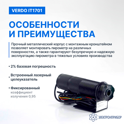 Стационарный пирометр VERDO IT1701 — это высокоточный прибор, предназначенный для бесконтактного измерения температуры различных объектов и сред. Он работает на основе инфракрасной технологии, улавливая и анализируя инфракрасное излучение, испускаемое объектом.