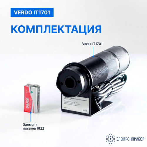 № Наименование Количество 1 Пирометр стационарный (-50…300°С)/(±2% или ±2°С); DS=50:1; k=0,95; 2 лазера VERDO IT1701 1 2 Элемент питания типа 6F22 1 -