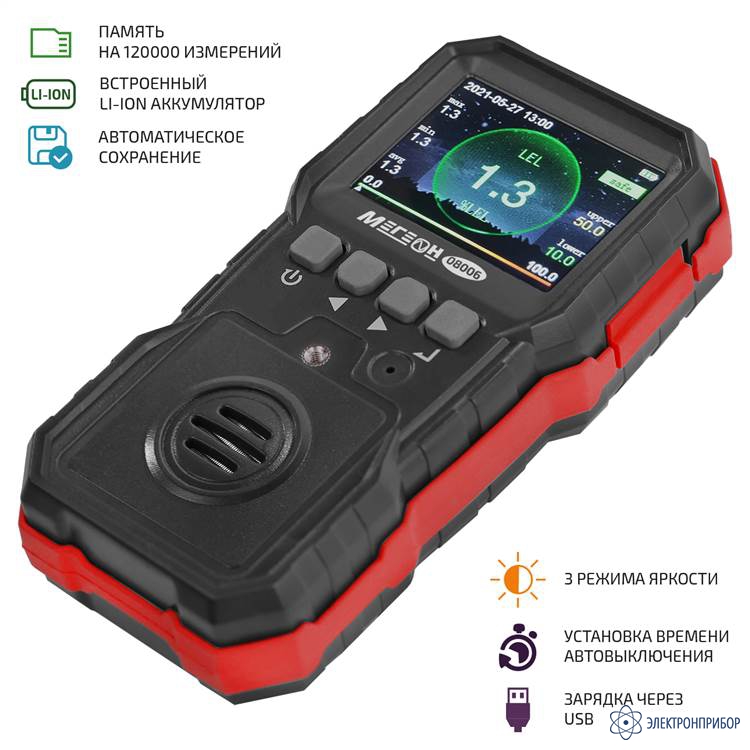 МЕГЕОН 08006 - новинка в модельном ряду измерителей концентрации горючих газов в воздухе, в бытовых и промышленных зданиях и сооружениях. Газоанализатор имеет современный эргономичный корпус с силиконовой вставкой противоскольжения. Для нагрудного ношения прибора на задней стенке предусмотрена стальная прищепка с кольцом, которая обеспечивает надёжное удержание, а также позволит закрепить анализатор на поясе. Все процессы отображаются на ярком цветном ЖК-дисплее. Данные могут быть записаны в память, которая позволяет сохранить до 120000 измерений. При этом обеспечивается удержание максимальных, минимальных и средних значений в автоматическом режиме.