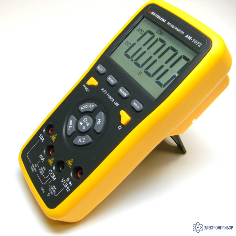 Мультиметр АМ-1072 предназначен для измерения постоянного и переменного тока и напряжения, сопротивления, ёмкости (до 60 мФ) частоты, проверки диодов и прозвонки электрических цепей.
