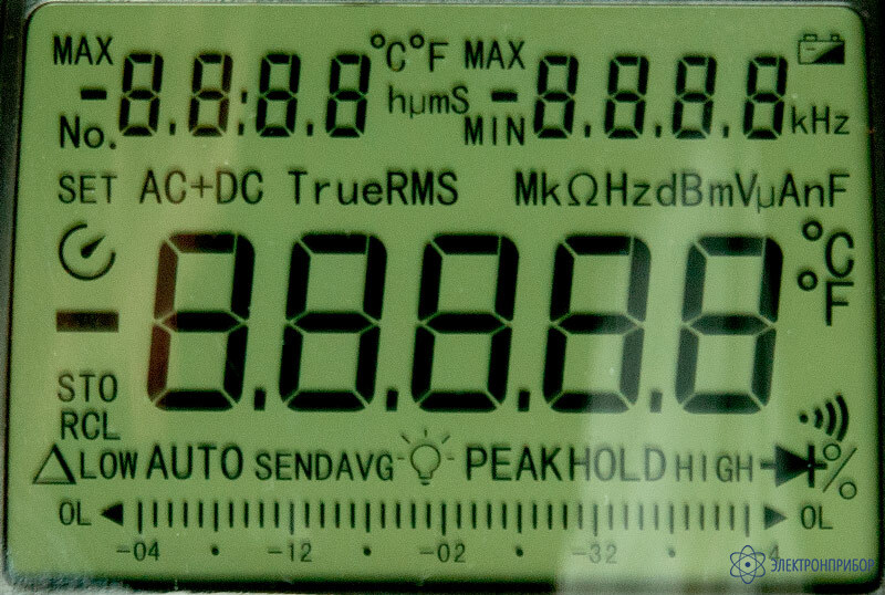 ± 2,5 %Термопара (тип) K-тип Проверка целостности цепи Напряжение в разомкнутой цепи около 1,2 В Разрешение 0,01 Ом Звуковой сигнал подается – цепь непрерывна При сопротивлении ≤40 Ом Звуковой сигнал не подается – цепь в разрыве При сопротивлении ≥60 Ом Тест диодов Напряжение в разомкнутой цепи около 2,8 В Разрешение 0,0001 мВ Нормальное напряжение PN перехода 0,5…0,8 В Регистрация, запись, вызов и передача данных (STORE) Шаг 0-255 с Максимальный количество отсчетов 100 Общие данные Измерение ист. скв. зн. Сигнал произвольной формы (TrueRMS) Скорость измерений 2-3 изм/с Дисплей основной дополнительный, аналоговая шкала Символьный ЖК-дисплей, 73 х 50 мм, цифровая шкала: 4000 отсчетов на обоих дисплеях (основной и дополнительный);