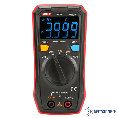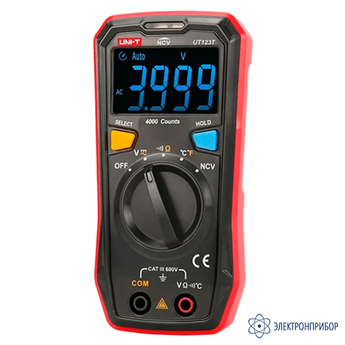 UNI-T UT123T – это удобный карманный мультиметр, разработанный для домашнего использования и базового технического обслуживания. Он измеряет постоянное и переменное напряжение, сопротивление, а также оснащен функцией прозвонки цепей. Прибор автоматически определяет тип сигнала (AC/DC) при напряжении выше 0,5 В, что упрощает работу без необходимости ручного выбора режима. Для сигналов ниже 0,5 В можно вручную выбрать режим с помощью кнопки SELECT.