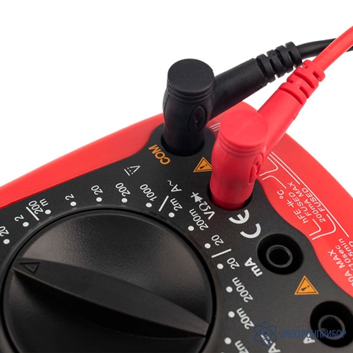 0,1 Ом Напряжение холостого хода около 2,8 В. Раздается звуковой сигнал зуммера, если сопротивление цепи менее 70 Ом. Положение переключателя Разрешение Точность Тестирование транзисторов hFE 1β Напряжение коллектор-эмиттер 2,8 В. Ток базы 10 мкА. На дисплее значение испытания транзистора (NPN, PNP) ближайший значение HFE (0 ~ 1000β) Предел Разрешение Точность Защита от перегрузки Температура -40°C ~ 0°C 1°С ±(3%+40) 250 В rms 0°C ~ 400°C ±(1%+30) 400°C ~ 1000°C ±(2%+50) Параметр Значение Общие характеристики Защита входных терминалов Терминал mA защищен предохранителем 0.5 А/250 В, ∅5х20 мм Максимальное показание дисплея 1999, обновляется 2-3 раза в секунду Выбор диапазонов измерений Ручной Отображение полярности автоматическое Диапазон рабочих температур 0°С…+40°С Диапазон температур хранения -10°С…+50°С Относительная влажность ≤75% при температуре 0°С…+30°С; ≤50% при температуре +30°С…+40°С Электромагнитная совместимость в радиочастотных полях 1В/м – точность соответствует указанной + 5% диапазона, в радиочастотных полях более 1В/м – точность не указана Батарея 9В типа NEDA1604, 6F22 или 006P, индикация разряженной батареи Индикация режима Data Hold Индикатор отображается на экране Индикация отрицательной полярности Индикатор отображается на экране Индикация выхода за пределы диапазона Индикатор «1» Размеры 179 х 88 х 39 мм Масса Около 380 г (с батареей) Безопасность/соответствие стандартам IEC1010 CATII 1000В, CATIII 600 В, двойная изоляция -