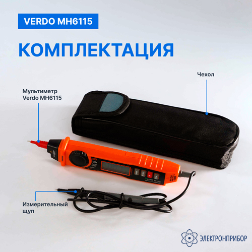 № Наименование Количество 1 Мультиметр портативный карандашного типа 0,7%, 2000 отсчетов VERDO MH6115 1 2 Чехол 1 -