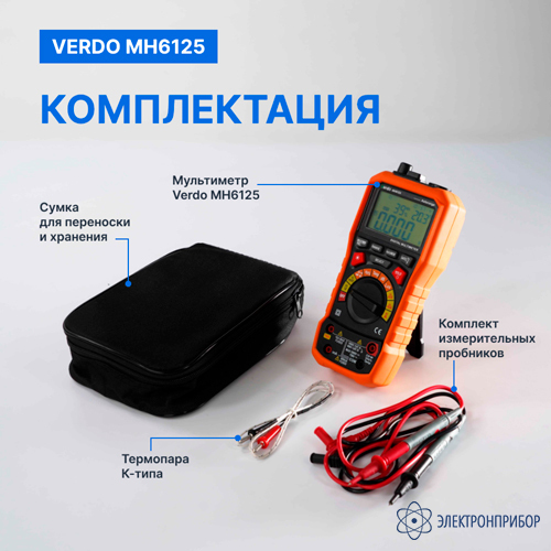 № Наименование Количество 1 Мультиметр портативный многофункциональный 0,7%, 6000 отсчетов VERDO MH6125 1 2 Комплект измерительных пробников 1 3 Термопара К-типа 1 4 Чехол 1 -