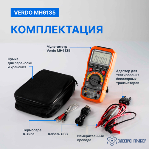 № Наименование Количество 1 Мультиметр портативный 0,7%, 6000 отсчетов VERDO MH6135 1 2 Измерительные провода 2 3 Термопара K- типа 1 4 Адаптер для тестирования биполярных транзисторов 1 5 Чехол 1 -