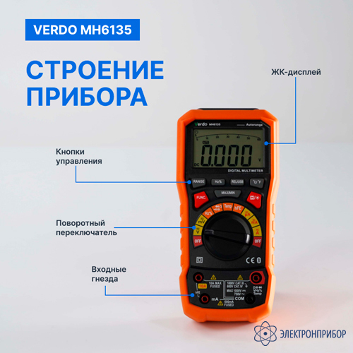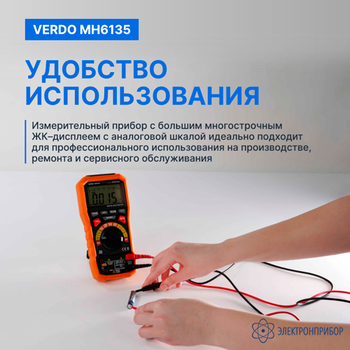 Мультиметр VERDO MH6135 – это многофункциональный ручной цифровой мультиметр с функцией отображения истинного среднеквадратичного значения (TrueRMS), большим многострочным жидкокристаллическим дисплеем с аналоговой шкалой, что облегчает считывание показаний. Передача измеренных значений величин в ПО обработки. Этот многофункциональный измерительный прибор идеально подходит как для профессионального использования на производстве, ремонта и сервисного обслуживания, так и для обучения и бытового применения.