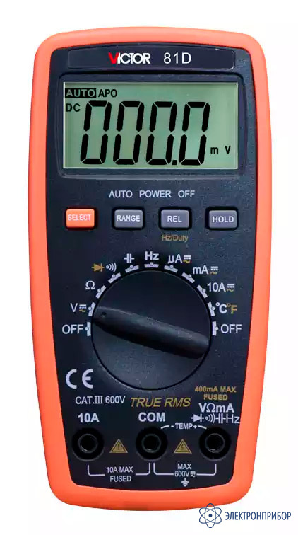 Мультиметр цифровой Victor 81D является многофункциональным прибором с ручным выбором режимов измерений с помощью переключателя и входными утепленными в корпус гнездами колонкового типа. Мультиметр представляет собой надежный компактный цифровой прибор с батарейным питанием.