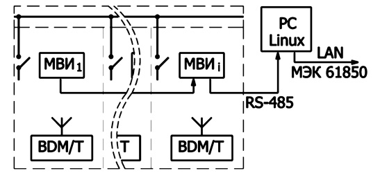 Если необходим непрерывный контроль технического состояния изоляции нескольких ячеек одного КРУ, всех или только наиболее технологически значимых, то отдельные приборы МВИ в этих ячейках последовательно (при помощи интерфейса связи RS-485) включаются в общую систему, подключаемую к головному компьютеру или контроллеру.