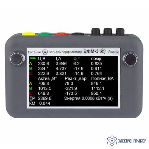 Вольтамперфазометр ВФМ-3 предназначен для одновременного измерения действующего значения трех фазных и трех линейных напряжений, силы переменного тока в трех цепях с одновременным вычислением активной, реактивной и полной мощностей в цепи, измерения частоты, угла сдвига фаз между фазными и линейными напряжениями, между токами и напряжениями, а также вывода векторной диаграммы напряжений и токов в трехфазных системах.