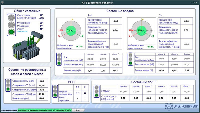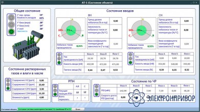 Вся необходимая информация о работе трансформатора, как первичная, так и специально обработанная, отображается на экране компьютера АРМ в цифровом значении и в виде стандартных светофоров состояния - «зеленый», «желтый», «красный», предназначенных для оперативного персонала. Специальный диагностический персонал может проводить углубленную многофакторную обработку трендов и диагностических заключений.