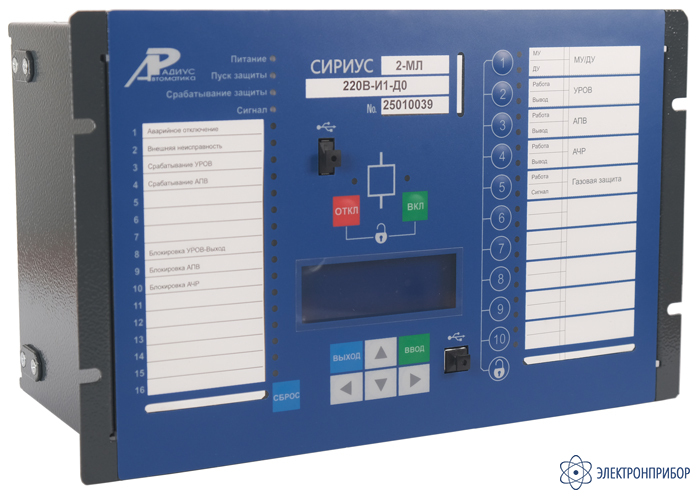 «Микропроцессорное устройство защиты «Сириус-2-МЛ-220В-И1-Д1» ТУ 3433-002-54933521-2009».Сириус-2-МЛ-БПТ напряжение оперативного питания 220 В, с возможностью подпитки от цепей тока, встроенное реле «дешунтирования», без дополнительных интерфейсов (только USB-A, USB-B, RS485-PPS и 2хRS485), с встроенной дуговой защитой с возможностью подключения до трёх оптических датчиков: