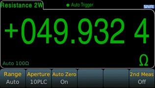 В этом режиме на дисплей выводится измеренное значение сопротивления, подключенного по 4-проводной схеме. Такие измерения существенно более точны при измерении малых значений сопротивления, так как 4-проводная схема измерений позволяет скомпенсировать влияние контактных сопротивлений и сопротивления измерительных проводов.