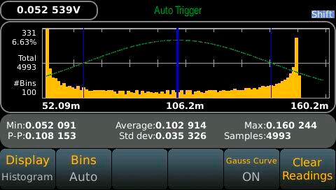 Фиксация минимальных (Min) и максимальных (Max) значений измеренных величин есть во всех приборах VERDO MB2100. Дополнительно к этому в приборах VERDO MB2105, VERDO MB2106, VERDO MB2107 есть фиксация пикового (P-P), среднего (Average), стандартного отклонения (Std dev) и общего количества выборок в текущем буфере считывания (до 10 000 данных). При этом прибор может выводить выборки измерений в виде гистограммы и сравнивать распределение результатов с нормальным.