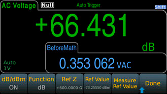 При использовании математической функции «дБ» (децибелы), результат измерений входного напряжения прибором пересчитывается в децибелы относительно задаваемого пользователем опорного напряжения Vref по формуле: dB=20 log(Vin/Vref).