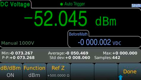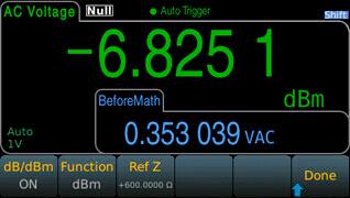 При использовании функции дБм (децибелы мощности) результат измерения пересчитывается как децибелы мощности относительно опорного значения в 1 мВт по формуле dBm=10log((Vin2)/(Zref*1mW)). Пользователь может изменять значение опорного импеданса Zref для воссоздания своих условий измерения.