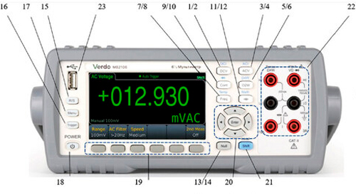 № Наименование Количество 1 Мультиметр настольный (вольтметр) 6 1/2 разряда, погрешность 0,0035% VERDO MB2106 1 2 Измерительные провода 1 3 Кабель сетевой 1 4 Предохранитель номинал 500 мА 2 5 Предохранитель номинал 1 А 2 6 Кабель интерфейса USB-2.0 1 -