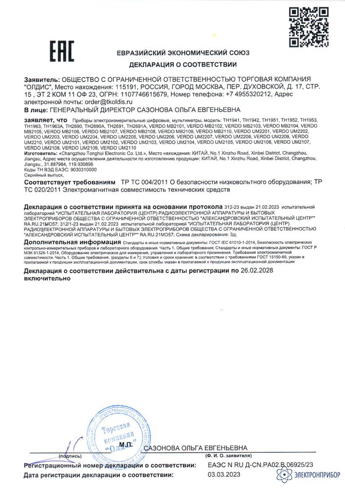 Параметр Значение VERDO MB2101 VERDO MB2102 VERDO MB2105 VERDO MB2106 VERDO MB2107 Напряжение постоянного тока Пределы измерений 200 мВ/2 В/ 20 В/200 В/ 1000 В 500 мВ/5 В/50 В/ 500 В/1000 В 100 мВ/1 В/10 В/100 В/1000 В Разрешение 10 мкВ/100 мкВ/1 мВ/10 мВ/100 мВ 1 мкВ/10 мкВ/ 0,1 мВ/1 мВ/10 мВ 0,1 мкВ/1 мкВ/10 мкВ/0,1 мВ/1 мВ Наилучшая относительная погрешность* 0,03% 0,02% 0,01% 0,0035% 0,0075% Сила постоянного тока Пределы измерений 2 мА/20 мА/ 200 мА/2 А/20 А 5 мА/50 мА/ 500 мА/5 А/20 А 100 мкА/1 мА/10 мА/100 мА/1 А/3 А/10 А Разрешение 0,1 мкА/1 мкА/10 мкА/100 мкА/1 мА 1 нА/10 нА/ 0,1 мкА/1 мкА/ 10 мкА/10 мкА/ 100 мкА 0,1 нА/1 нА/10 нА/0,1 мкА/ 1 мкА/10 мкА/10 мкА Наилучшая относительная погрешность* 0,08% 0,05% 0,02% Сопротивление постоянному току Пределы измерений 200 Ом/2 кОм/20 кОм/ 200 кОм/2 МОм/20 МОм 10 Ом/100 Ом/1 кОм/10 кОм/ 100 кОм/1 МОм/10 МОм/100 МОм Разрешение 10 мОм/0,1 Ом/1 Ом/10 Ом/ 100 Ом/1 кОм 0,1 мОм/1 мОм/ 10 мОм/0,1 Ом/ 1 Ом/ 10 Ом/ 100 Ом/1 кОм 10 мкОм/0,1 мОм/1 мОм/ 10 мОм/ 0,1 Ом/1 Ом/ 10 Ом/100 Ом Наилучшая относительная погрешность* 0,1% 0,03% 0,006% Частота периодических сигналов** Пределы измерений 5-10 Гц/100 Гц/ 100 кГц/1 МГц 5-10 Гц/100 Гц/ 100 кГц/1 МГц 3-10 Гц/100 Гц/1 кГц/10 кГц 100 кГц/ 300 кГц/ 1 МГц 2-10 Гц/100 Гц/1 кГц/10 кГц/ 100 кГц/300 кГц/1 МГц 2-10 Гц/100 Гц/ 1 кГц/10 кГц/ 100 кГц/300 кГц Разрешение 100 мкГц/1 мГц/ 10 мГц/10 Гц 100 мкГц/1 мГц/ 10 мГц/10 Гц 10 мкГц/100 мкГц/1 мГц/10 мГц/100 мГц/1 Гц/1 Гц Наилучшая относительная погрешность* 0,01% 0,01% 0,005% 0,01% 0,012% Период следования импульсов Пределы измерений 1-10 мкс/10 мс/100 мс/200 мс - - - Разрешение 0,1 нс/1 нс/1 мкс/10 мс - - - Наилучшая относительная погрешность* 0,01% - - - Электрическая емкость Пределы измерений - 1 нФ/10 нФ/100 нФ/1 мкФ/10 мкФ/100 мкФ/ 1 мФ/10 мФ Измерительный ток - 10 мкА/10 мкА/10 мкА/ 100 мкА/100 мкА/1 мА/10 мА/10 мА Наилучшая относительная погрешность* - 0,5% 1% 0,5% Напряжение переменного тока Пределы измерений 200 мВ/2 В/20 В/ 200 В/750 В 500 мВ/5 В/50 В/ /500 В/700 В 100 мВ/1 В/10 В/100 В/750 В Разрешение 10 мкВ/100 мкВ/ 1 мВ/10 мВ/ 100мВ 10 мкВ/100 мкВ/ 1 мВ/10 мВ/ 100 мВ 1 мкВ/10 мкВ/ 0,1 мВ/1 мВ/10 мВ 0,1 мкВ/1 мкВ/10 мкВ/0,1 мВ/1 мВ Диапазон частот 20 Гц - 100 кГц 20 Гц - 100 кГц 3 Гц - 300 кГц Наилучшая относительная погрешность* 0,4% 0,35% 0,1% 0,06% 0,09% Сила переменного тока Пределы измерений 2 мА/20 мА/ 200 мА/2 А/20 А 5 мА/50 мА/ 500 мА/5 А/20 А 100 мкА/1 мА/10 мА/100 мА/1 А/3 А/10 А Разрешение 0,1 мкА/10 мкА/ 100 мкА/1 мА/ 10 мА 0,1 мкА/10 мкА /100 мкА/ 1 мА/10 мА 1 нА/0,1 мкА/0,1 мкА/ 1 мкА/ 10 мкА/ 10 мкА/100 мкА 0,1 нА/1 нА/10 нА/100 нА/ 1 мкА/1 мкА/10 мкА Диапазон частот от 20 Гц до: 20 кГц/20 кГц/ 20 кГц/2 кГц/ 2 кГц от 20 Гц до: 20 кГц/20 кГц/ 20 кГц/2 кГц/ 2 кГц 3 Гц - 10 кГц Наилучшая относительная погрешность* 0,5% 0,5% 0,2% 0,1% Общие характеристики Разрядность дисплея 4 1/2 4 1/2 5 1/2 6 1/2 Интерфейсы подключения к ПК USB Device USB Device + RS232C USB Device, USB Host, RS232C, LAN Потребляемая мощность, В·А, не более 10 30 Питание переменное напряжение от 198 до 242 В/от 47,5 до 52,5 Гц Нормальные условия: