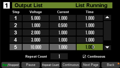 Редактируя значение и продолжительность настройки одного шага, функция списка может генерировать несколько последовательностей для удовлетворения сложных требований к испытаниям. Пользователь может редактировать последовательность из 50 шагов или импортировать файл последовательности через USB. С помощью панели можно управлять 8 наборами встроенных выходных сигналов.