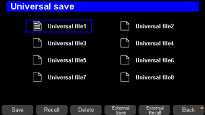 Источник питания позволяет пользователям сохранять в памяти несколько типов файлов для последующего вызова. Источник питания имеет энергонезависимую внутреннюю память и доступ к внешней памяти через интерфейс USB Host на задней панели.