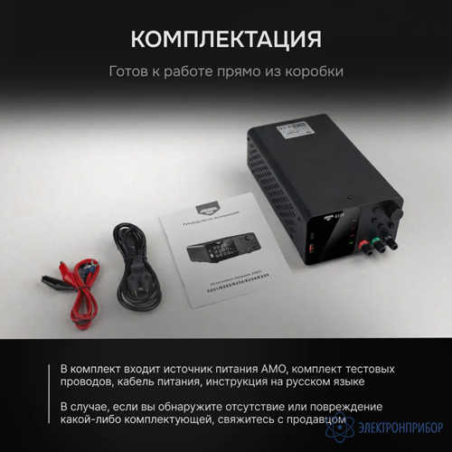 № Наименование Количество 1 Источник питания AMO E233 1 2 Кабель питания 1 3 Комплект тестовых проводов с зажимами типа "крокодил" 1 -