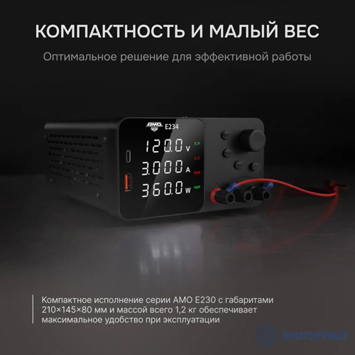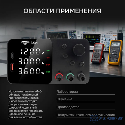 Источник питания AMO E234 разработан для специалистов, которым необходим стабильный и регулируемый источник высокого напряжения. С диапазоном от 0,01 до 120 В при токе до 3 А и мощностью до 360 Вт, он подходит для испытаний изоляции, питания электронно-лучевых трубок, тестирования высоковольтных модулей и обучения в технических вузах. Три цифровых дисплея одновременно показывают напряжение, ток и мощность, что устраняет необходимость в дополнительных измерительных приборах.