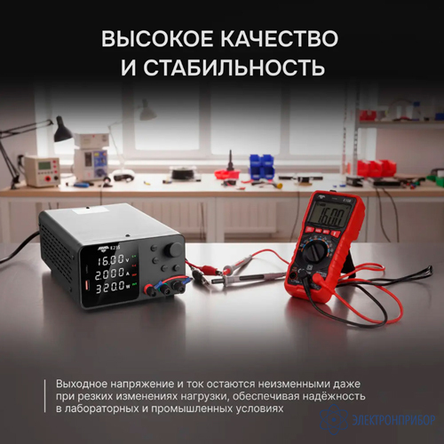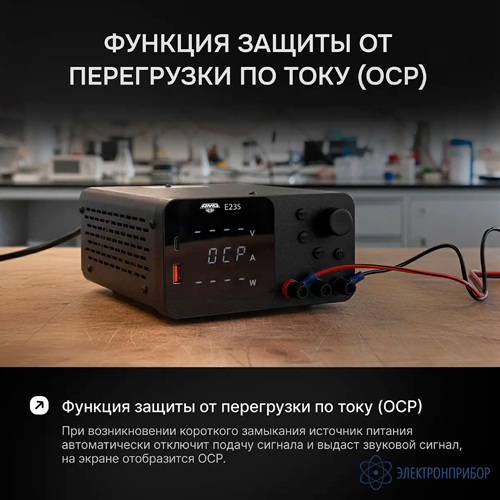 Безопасность при работе. Встроенная защита от перегрузки по току (OCP) мгновенно ограничивает выходной ток при превышении установленного пользователем значения, предотвращая повреждение как самого источника, так и подключенной нагрузки.