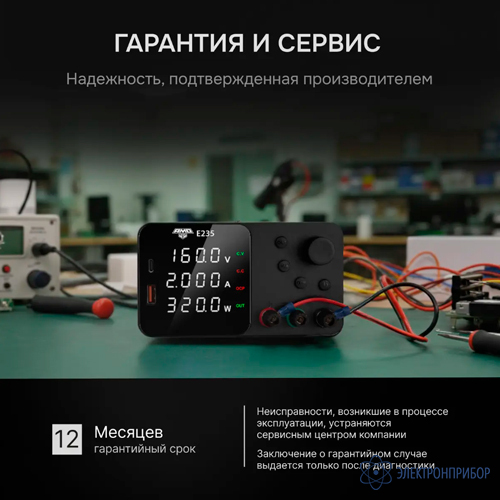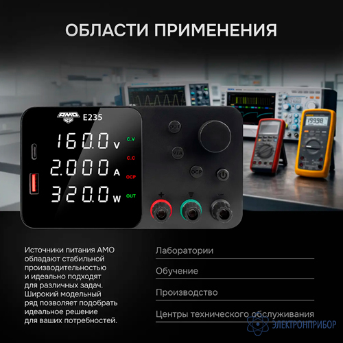 Источник питания AMO E235 — это флагманская модель серии E230, разработанная для выполнения самых требовательных задач, где необходима стабильная подача высокого напряжения в сочетании с лабораторной точностью. С диапазоном регулировки выходного напряжения от 0,01 до 160 В и максимальным током до 2 А, прибор обеспечивает выходную мощность до 320 Вт, что делает его полезным при испытаниях изоляции, питании газоразрядных ламп, калибровке измерительных систем и проведении научных экспериментов с высоковольтными компонентами.