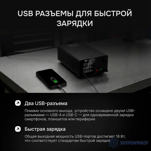 Универсальность в повседневной работе. Помимо основного регулируемого выхода, AMO E235 оснащен двумя USB-разъемами — USB-A и USB-C — которые позволяют одновременно заряжать смартфоны, планшеты, измерительные клещи или другие периферийные устройства. Общая мощность USB-портов достигает 18 Вт, что соответствует современным стандартам быстрой зарядки. Трехразрядный цифровой дисплей выводит не только напряжение и ток, но и мгновенную мощность в ваттах, что упрощает расчет тепловых и энергетических параметров нагрузки.