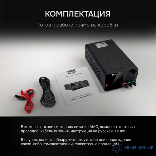 № Наименование Количество 1 Источник питания AMO E235 1 2 Кабель питания 1 3 Комплект тестовых проводов с зажимами типа "крокодил" 1 -