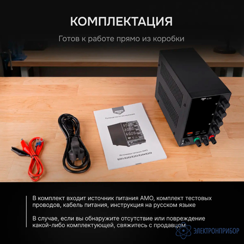 № Наименование Количество 1 Источник питания AMO E255 1 2 Кабель питания 1 3 Комплект тестовых проводов с зажимами типа "крокодил" 1 -
