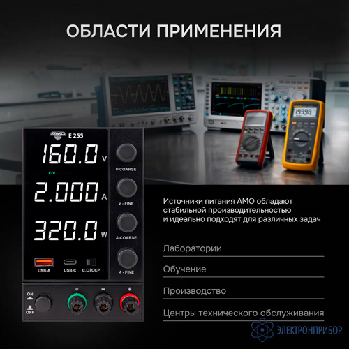 Источник питания AMO E255 — это флагманская модель серии E250 с самым широким диапазоном выходного напряжения — до 160 В. Он предназначен для выполнения узкоспециализированных задач, где требуется высокая стабильность, точность и безопасность при работе с экстремальными напряжениями. С током до 2 А и максимальной мощностью 320 Вт, прибор используется для испытаний изоляции, питания газоразрядных ламп, калибровки высоковольтных датчиков и проведения физических экспериментов.