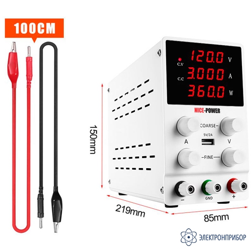 Параметр Значение Количество каналов 1 Тип импульсный Выходное напряжение 0~120 В, точность установки 0,01 В Выходной ток 0~3 А, точность установки 0,001 А Высокая стабильность и малые пульсации ≤ 30 мВ rms, ≤ 20 мА rms Малое влияние нагрузки ≤ 0,5% ±3 мВ, ≤ 0,3% ±3 мА Малое влияние сетевого напряжения ≤ 0,1% ±3 мВ, ≤ 0,2% ±3 мА Функция USB-зарядки 5 В/2 А Вентилятор охлаждения есть Режимы стабилизации тока и напряжения есть Индикация 4-разрядные LED-дисплеи на ток, напряжение и мощность, точность ±(0,5%+2) Защита от короткого замыкания есть Рабочая температура от 0°С до 40°С, влажность <80% Температура хранения от -10°С до 70°С, влажность <70% Питание 230 В ±10% Габариты прибора 219х150х85 мм Вес прибора 1,2 кг Сравнительные характеристики источников питания Nice-Power SPS: