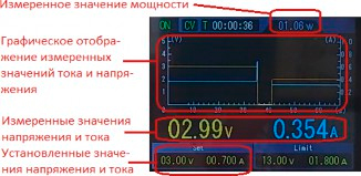 Экран прибора позволяет одновременно отображать установленные и измеренные значения напряжения, тока, а также позволяет выводить на экран потребляемую мощность подключенной нагрузки. Указанная функция может быть весьма полезна при разработке электронных устройств, а также при их диагностике и ремонте.