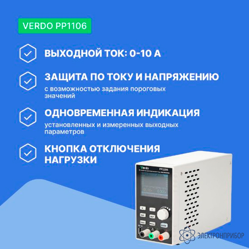 Источник питания VERDO PP1106 программируемый лабораторный имеет импульсную схемотехнику, благодаря чему при компактном размере и небольшой цене обеспечивают выходное напряжение до 60 В, ток до 10 А и мощностью до 300 Вт. Цветной графический дисплей лабораторного источника питания VERDO PP1106 позволяет строить на экране тренды измеренных выходных напряжения и тока, а USB – интерфейс с поддержкой SPCI команд дает возможность управлять режимами работы источника питания с ПК.