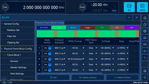 Для разработки, производства и тестирования беспроводных терминалов генератор поддерживает имитацию сигналов беспроводного соединения по стандартам 802.11a/b/g/n/ac/ax, включая форматы PPDU, MPDU, A-MPDU и другие.