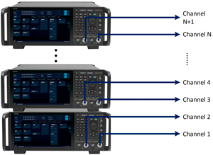 Прибор поддерживает соединение нескольких устройств вместе (каскадирование), что позволяет создавать сложные системы с несколькими источниками сигналов и точным контролем фазы.