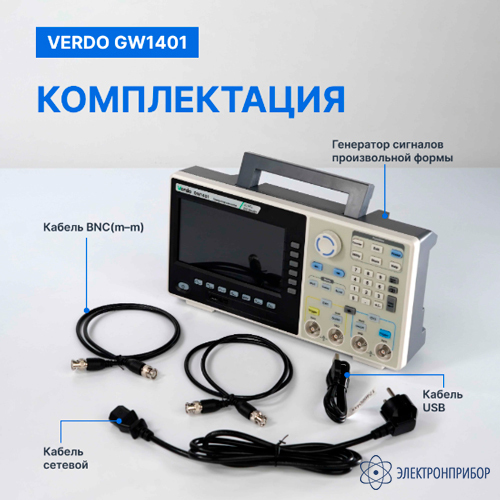 № Наименование Количество 1 Генератор сигналов 30 МГц, 500 Мвыб/с VERDO GW1401 1 2 Кабель сетевой 1 3 Кабель USB 1 4 Компакт-диск с ПО 1 5 Кабель BNC(m–m) 1 -