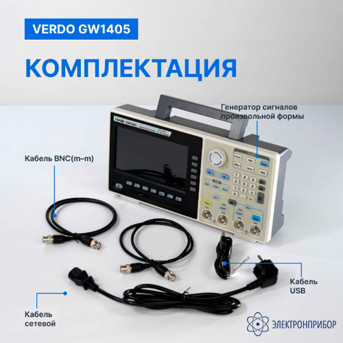 № Наименование Количество 1 Генератор сигналов 100 МГц, 500 Мвыб/с VERDO GW1405 1 2 Кабель сетевой 1 3 Кабель USB 1 4 Компакт-диск с ПО 1 5 Кабель BNC(m–m) 1 -