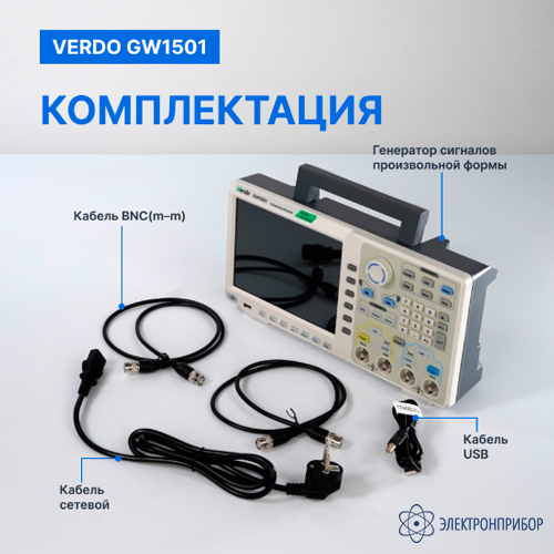 № Наименование Количество 1 Генератор сигналов 80 МГц, 1250 Мвыб/с VERDO GW1501 1 2 Кабель сетевой 1 3 Кабель USB 1 4 Компакт-диск с ПО 1 5 Кабель BNC(m–m) 2 -