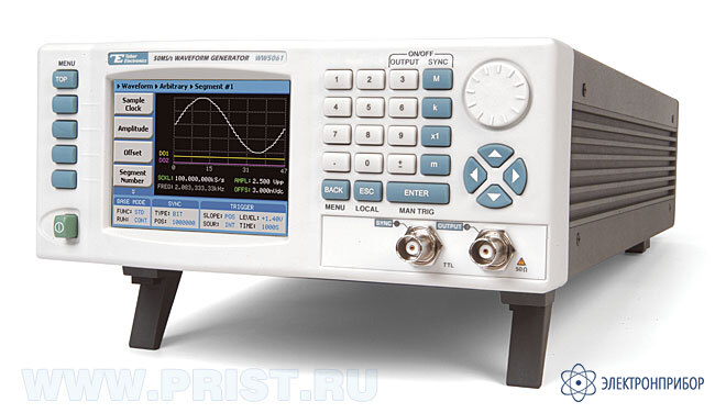 Генератор сигналов произвольной формы WW5061: 1 канал; Выходной сигнал: синус, треугольник, меандр, импульс, пила, Sin X/X, гауссовский и экспоненциальный сигналы, шум, постоянное напряжение, произвольная форма; Диапазон частот: синус, меандр, импульс, пила – от 100 мкГц до 25 МГц, Sin X/X, гауссовский и экспоненциальный сигналы - от 100 мкГц до 3,125 МГц, треугольник - от 100 мкГц до 7,5 МГц; Шум: полоса частот до 12,5 МГц; Погрешность установки частоты ±1*10-6; Выходной уровень от 10 мВ до 10 Впик на 50 Ом; Постоянное смещение от 0 до 4,5 В; Разрешение: по частоте - 12 разрядов, по амплитуде - 4 разряда; Виды модуляции: АМ, ЧМ, ЧМн, ИМ, ГКЧ; Выход ТТЛ с вводимой задержкой; Синхронизация: автоматическая, ручная, внешняя, мультигенераторная; Сигналы произвольной формы: ЦАП 14 бит; Дискретизация - от 100 мГц до 50 МГц, память 0,5 М; Цветной ЖКИ с подсветкой, 9 см, разрешение 320х240; ПО для формирования сигнала произвольной формы и управления; Интерфейсы: LAN, USB, GPIB; Масса 3 кг.