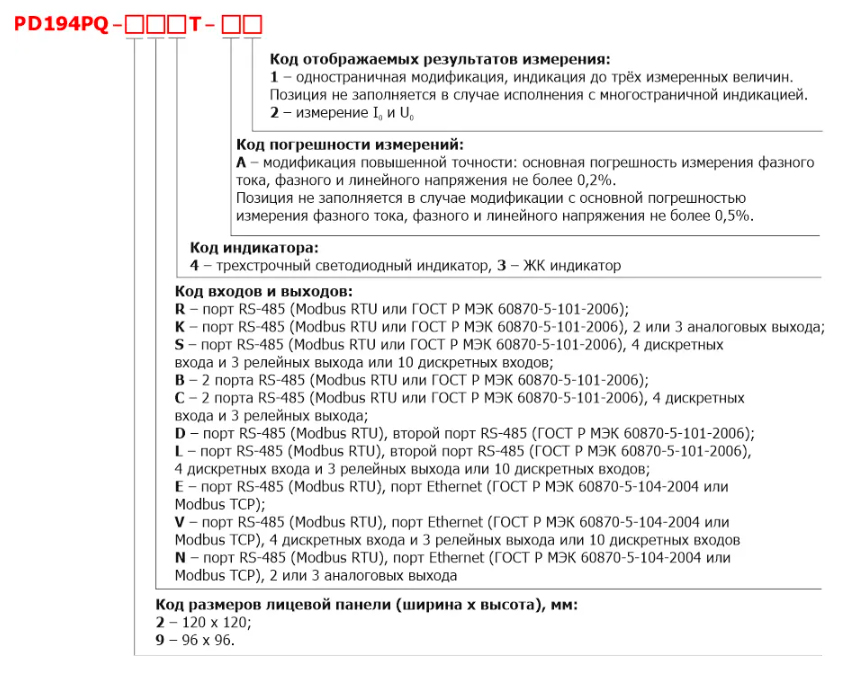 Модификация Индикатор/кол-во строк (2) Кол-во фаз (каналов) Кол-во портов RS-485 с протоколом RTU (3) Кол-во портов RS-485 с протоколом 101 или RTU (3) Кол-во портов Ethernet с протоколом 104 или ТСР (3) Кол-во налоговых выходов Кол-во дискретных входов/ код входа Кол-во дискретных выходов/ код выхода PD194PQ-2[9]R4T СД/3 3 1 - - - - - PD194PQ-2[9]K4T СД/3 3 1 - - 2/3 (4) - - PD194PQ-2[9]S4T СД/3 3 1 - - - 4/1 3/1 PD194PQ-2[9]S4T СД/3 3 1 - - - 10/1 0 PD194PQ-2[9]B4T СД/3 3 2 - - - - - PD194PQ-2[9]C4T СД/3 3 2 - - - 4/1 3/1 PD194PQ-2[9]C4T СД/3 3 2 - - - 10/1 0 PD194PQ-2D4T СД/3 3 - 2 (5) - - - - PD194PQ-2L4T СД/3 3 - 2 (5) - - 4/1 3/1 PD194PQ-2L4T СД/3 3 - 2 (5) - - 10/1 0 PD194PQ-2E4T СД/3 3 - 2 (5) 1 - - - PD194PQ-2V4T СД/3 3 - 2 (5) 1 - 4/1 3/1 PD194PQ-2V4T СД/3 3 - 2 (5) 1 - 10/1 0 PD194PQ-2N4T СД/3 3 - 2 (5) 1 2/3 (4) - - Примечание: