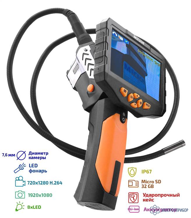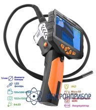 Большой ЖК-дисплей с разрешением 854х 480 и диагональю 4,3' отчётливо отобразит всё происходящее перед камерой. Зонд диаметром 6,9 мм и длиной 1 метр имеет полужёсткую конструкцию. Подсветка оснащена шестью яркими светодиодами со ступенчатой регулировкой яркости, которые обеспечивают работу в условиях полного отсутствия освещения.