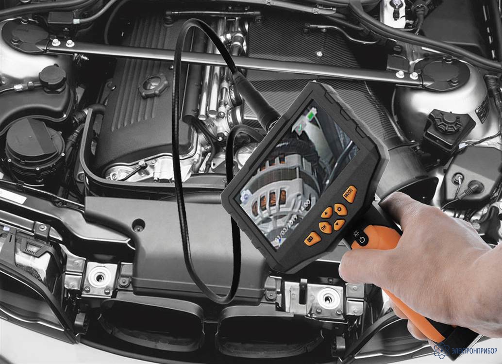 Помимо этого предусмотрено получение цветных изображений с помощью фотографий. Большой ЖК-дисплей с разрешением 854х 480 и диагональю 4,3' отчётливо отобразит всё происходящее перед камерой. Зонд диаметром 6,9 мм и длиной 5 метров имеет полужёсткую конструкцию. Подсветка оснащена шестью яркими светодиодами со ступенчатой регулировкой яркости, которые обеспечивают работу в условиях полного отсутствия освещения.