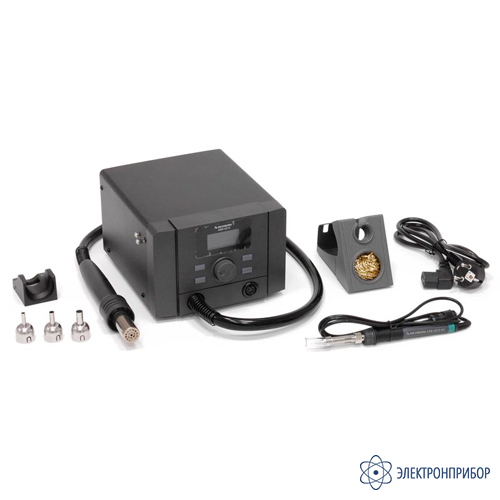 Параметр Значение Станция Потребляемая мощность 1350 Вт Напряжение питания стании 220…240 В, 50 Гц Габаритные размеры 180×210×131 мм Вес 3,3 кг Паяльник Мощность 70 Вт Регулировка температуры нагрева паяльника 100…480 °C Температурная стабильность ±2 °C Нагревательный элемент керамический Сопротивление между наконечником и землёй <2 Ом Потенциал наконечников относительно земли <2 мВ Термовоздушный канал Мощность 1280 Вт Диапазон температур 100 ...500 °С Бесщеточный вентилятор с плавной регулировкой Производительность 50 л/мин (макс.) Температурная стабильность ±5 °C Регулировка воздушного потока от 1 до 100 -